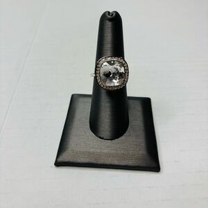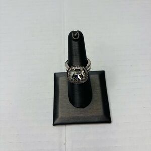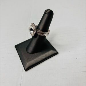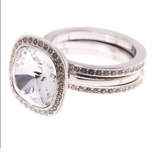 -One ring features a large clear crystal, the other sparkles softly in clear crystal pavé.