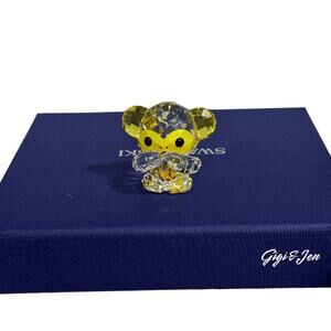 Designed by Hiroshi Yoshii, it represents the three wise monkeys, inspired by the proverbial principle 'see no evil, hear no evil, speak no evil'. This design features three Japanese macaques: Mizaru, covering his eyes, Kikazaru, covering his ears, and Iwazaru, covering his mouth. Shining with 1416 facets, they sparkle in clear and colored crystal with yellow, orange, and beige printed details. A showcase of Swarovski expertise, they are cute messengers of positivity and symbolism. Decoration object. Not a toy. Not suitable for children under 15.