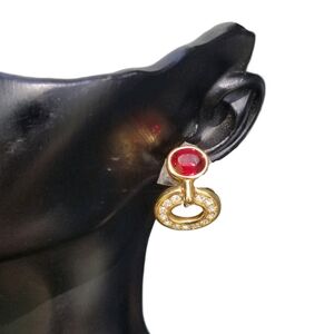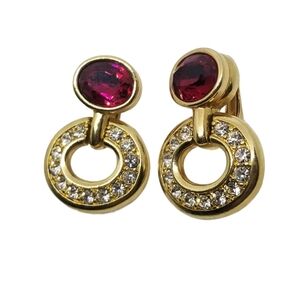 Beautiful, high quality earrings by Swarovski jewelry circa.1990s. Earrings are goldtone and set with a magenta color Swarovski crystal. Earrings have a door knocker style design with clip on style backs. They measure approx. 1-1/8 inches tall and 3/4 inch wide. Earrings are stamped on the backs with the trademark Swarovski swan. Excellent condition.