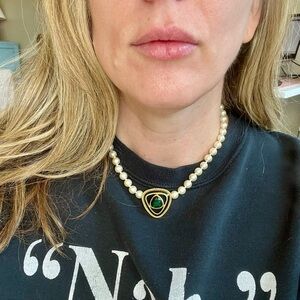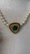 Faux pearl necklace featuring a striking green gem pendant. So beautiful. No callputs.