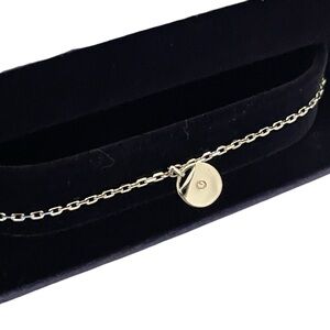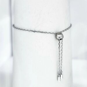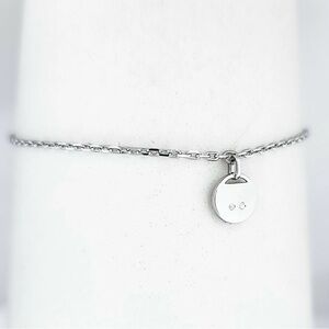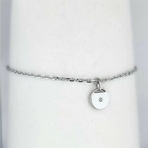 Silver rhodium dainty chain link bracelet with slide closure. Silver disc charm contains one crystal at center of one side and 2 crystals on other.