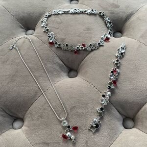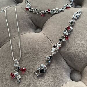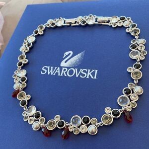 Swarovski Crystal silver tone (two necklaces and a matching bracelet) with bezeled faux pearls, clear & black faceted rhinestones and 4 dangling red plastic faceted teardrop pendants. Swarovski is signed on both clasps embellished with crystals. Measures