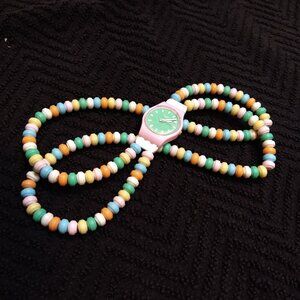 Just like a string of candies, the beads on this watch are so fun in pastel colors. Stretch band fits all sizes. This watch was a gift, and comes new in box. It is working, and ready to be gifted.
