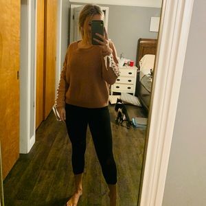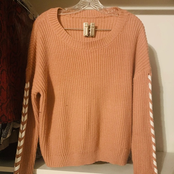 Pink lace up sleeve sweater, pair with mom jeans for a perfect fall outfit!