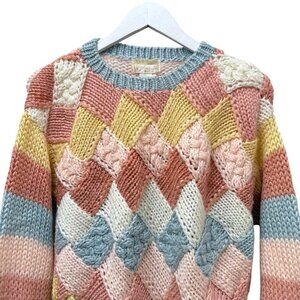 Wonderful basketweave harlequin knit on front, striped on sleeves and back
