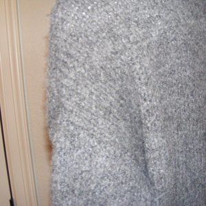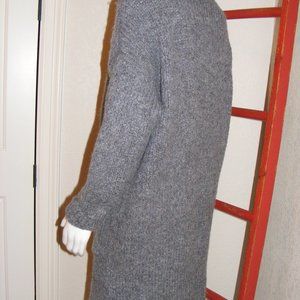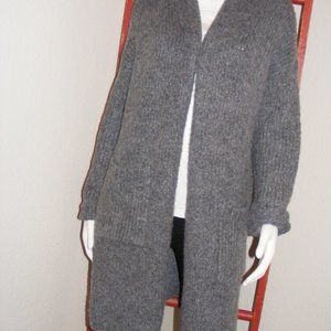 RENEEC SWEATER COAT: LONG, gray knitted sweater. Goes below the knees. Has two large front pockets