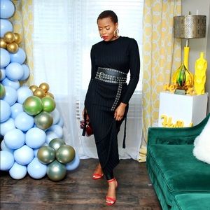 This fitted sweater dress is stylish and designed to be elegant with a touch of sexiness. It has a side slit coming up to the knee and a front and back mini cape. The model is wearing a Small. Dress is stretchy.