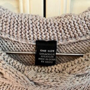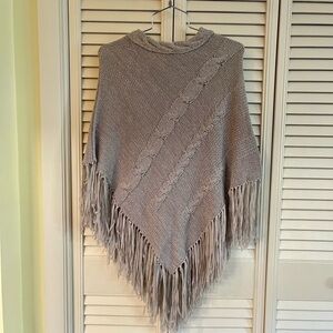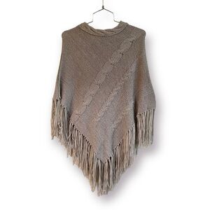 SWEATER PONCHO. 59% ACRYLIC, 41% NYLON. CABLE NECK & NYLON FRINGE AT BOTTOM. ONE SIZE.