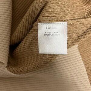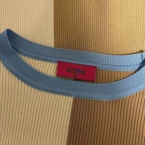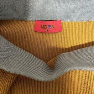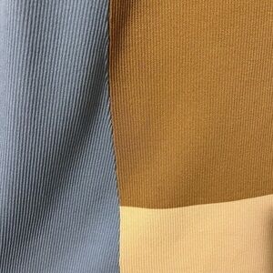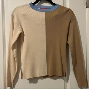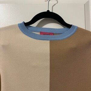 Features: Sweater and skirt set, matching, complete outfit, long sleeve, beige light brown and light blue colors, color block style, long sleeve sweater, high neck, midi skirt, ribbed material, soft material, never worn