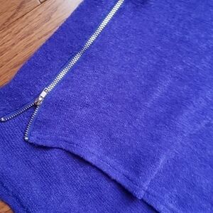 Front approximately 25 inches long and back 29 inches. Has a lot of stretch. Nice cobalt blue color with zippers on each side. There is no tags inside but I think this sweater is soft acrylic. Gently used. Size states XL, but is more like L. <sb3>