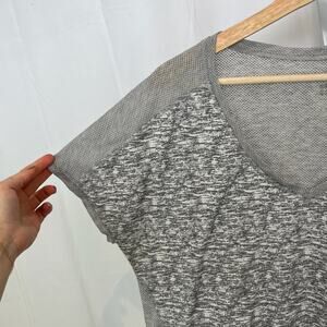 Short Sleeve Workout Tee from Sweaty Betty. V-neck, dolman short sleeves, pullover style, short. Gray is a lightweight, breathable mesh; front panel is a lightweight stretch performance fabric in gray. Reflective trim.