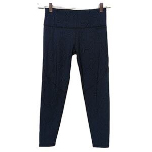 Navy and black geometric print The Power Leggings in 7/8 length by Sweaty Betty. Leggings have one side pocket, a back zippered pocket, and an inside drawstring. MSRP $108