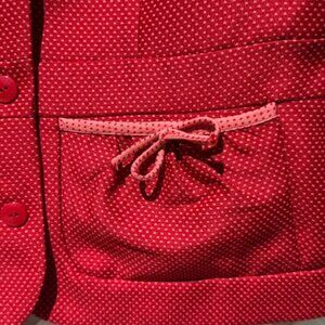 SUPERSWEET SANGRIA SALMON AND PINK POLK-A-DOT SUIT-SKIRT SET WITH BOWS ON POCKETS. THE LINING IS REVERSE, PINK WTH SALMON POLK- A- DOTS