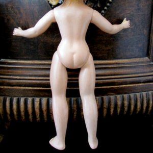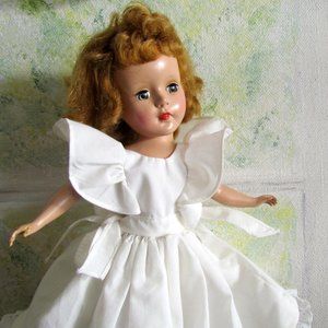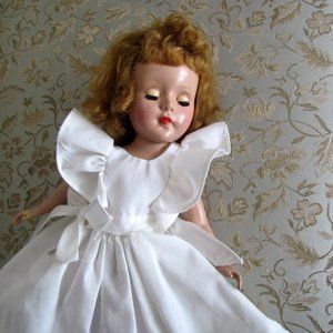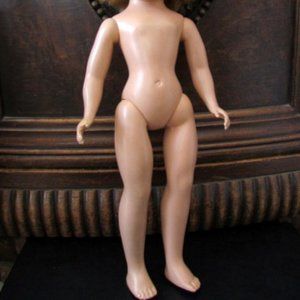 This lovely hard plastic vintage doll is a real sweetie. See all the photos. The pinafore she's wearing is not original, but I felt she should wear something. She'll come with shoes and stockings, too. She is marked "A. C." on the back of her neck, which means she's an American Character doll. She is called Sweet Sue.