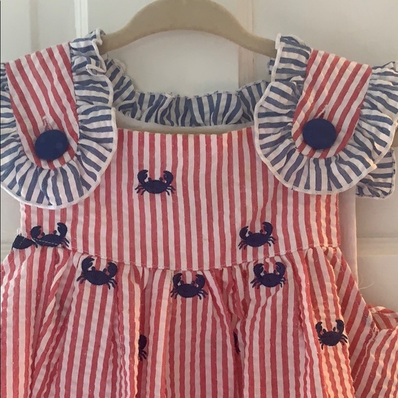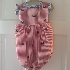 Darling romper in red white and blue. Perfect for summer holidays and beyond. Snaps on bottom. Buttons at top work. See pictures for details.