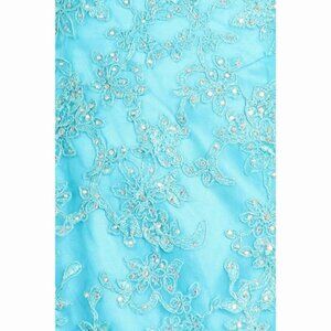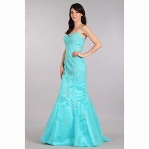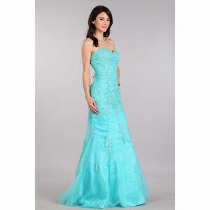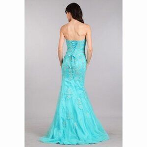 Strapless mesh mermaid style evening dress with beaded and rhinestone detailing, sweetheart neckline, and corset detail at back. Lined. Dress runs small. Please refer to size chart.