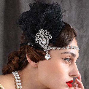 SWEETV 1920s Feather Headpiece Black, Women's Ostrich Feather Crystal Headband, Great Gatsby Hair Accessories for Women, Ribbon Tie