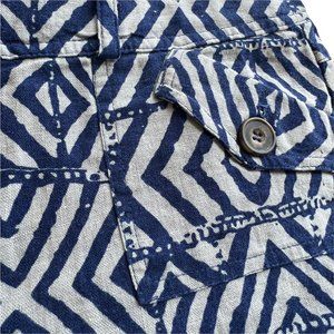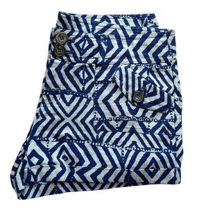 SWELL board shorts in navy and cream with a geometric design. Features a folded hem, folded front pockets that button, back pockets, belt loops, double button closure with tortoiseshell looking buttons. EUC.
