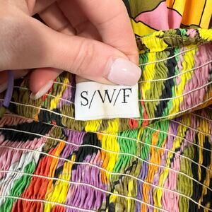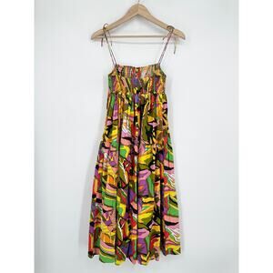S/W/F Birds of Paradise A-Line Dress Smocked Square Neck Tie Shoulder Midi Poplin