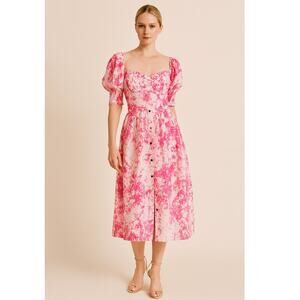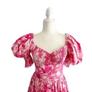 This S/W/F Puff Sleeve Sweetheart Dress channels effortless femininity with its romantic silhouette and fresh tie-dye pink print. Crafted from breathable cotton, it features a softly structured sweetheart neckline, smocked detailing at the cuffs, and voluminous puff sleeves that create a graceful, timeless look. A partial button-front closure and side pockets add practicality to its charm, while the midi length keeps it versatile for day-to-dinner wear.