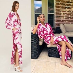 S/W/F's signature plunge dress is upgraded for the summer season in a deep magenta tie dye. This elegant maxi features a plunging neckline, kimono sleeving and an elegant, draped bodice equally comfortable and chic. A fitted waistline falls into a fluid floor length skirt with sultry leg split. Your answer to every invitation.