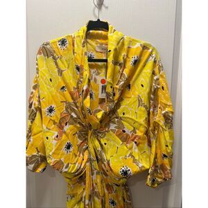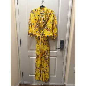 S/W/F Twist Front Plunge Midi Dress Summer Poolside Dress In Yellow Floral Wedding Guest size S NWT