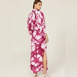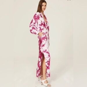Pink tie-dye rayon (100% Rayon). Maxi. V-neck. Long sleeves. Side zipper closure. 57" from shoulder to hemline. Imported.