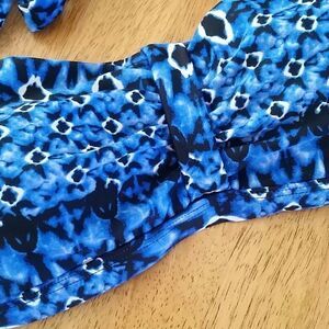 Beautiful Blue Black and White Pattern. Bandeau, Ties at Neck, Two Hook Back Closure. Complete U Underwire For Better Support. Lifting Padded Cups, Soft Side Boning For Added Comfort and Fit. Gathered and Ruched Cup Details.