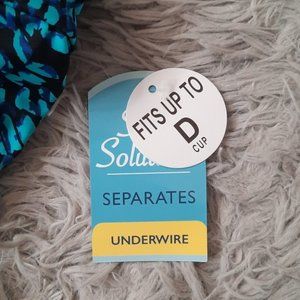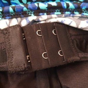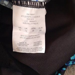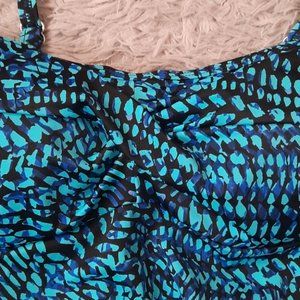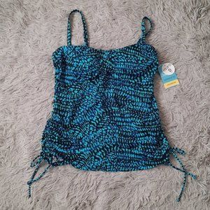 Blue and black printed Sea Swirl Tankini Swim Top. Adjustable shirring on sides. Twist front top. Underwire. Adjustable straps.