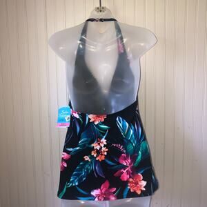 SWIM SOLUTIONS Retail $72 Black Floral Printed Tiered Halter Tankini Top Size 12