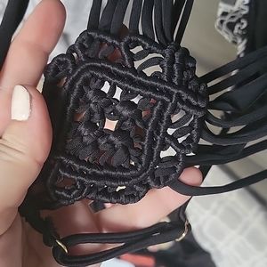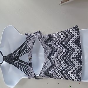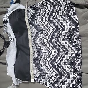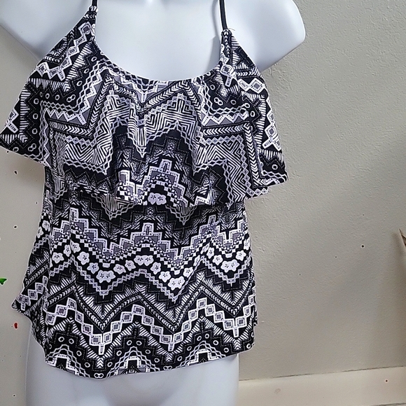 brand new with tags! classic black and white print! the bust has a flower layer over and it adds a little hint of femininity with a somewhat athletic type of item! hold hook closure with a cutout showing back and the super water detailed racer back