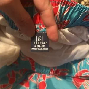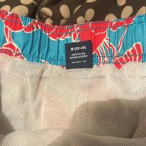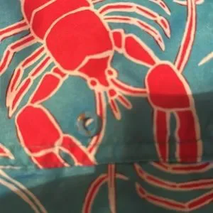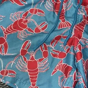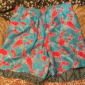 Swim trunks good condition see picture of button on back . Size 32-34. Turquoise and red lobsters .
