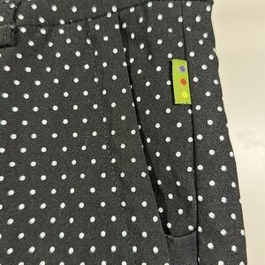 Perfect on or off the golf course. Pull on with elasticized waistband. Two front pockets. Two back pockets. Stretch material. Built-in tummy control. Slim fit. Slit at side hems. Figure flattering. Black with small white polka dots throughout. Fitted. Casual. Resort wear. Country club. H