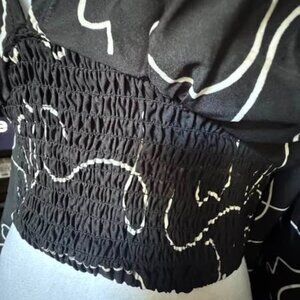 This super cute black top in size M is all about playful charm, featuring puffy sleeves and a whimsical white swirl across the fabric. Designed with an elastic waist for comfy wear, it measures 16 inches from shoulder to hem and 16 inches across from armpit to armpit—perfect for a stylish, cozy fit!
