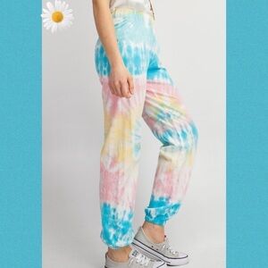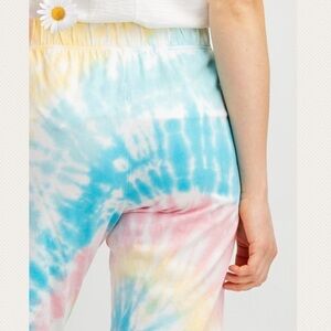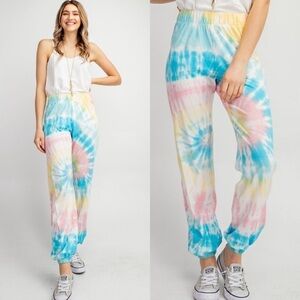 Aqua, Yellow & Pink Tie Dyed Supima Comfy Cotton Pants with Elastic Waistband & elastic leg opening at cuff. Super comfy & long. Inseam in Sm is 32”. Supima Cotton is a superior type of cotton grown in the USA. What makes it unique is it’s extra long staple fiber that gives the cotton it’s premium properties; strength, softness & color retention.