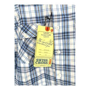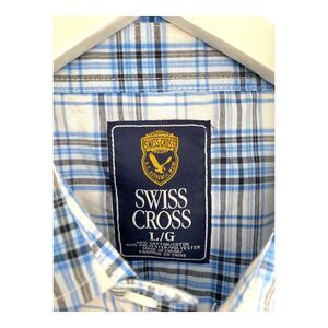 This Swiss Cross blue plaid shirt is perfect for any occasion, whether you're traveling, working, or just looking for a casual outfit. Made from a comfortable blend of polyester and cotton, this button-up shirt features long sleeves, a collared neckline, and a button-down collar style. It comes in size L and has accents of button closures and pockets for convenience.