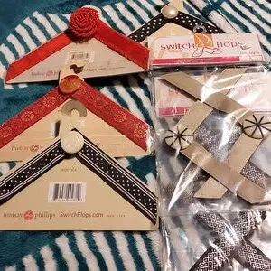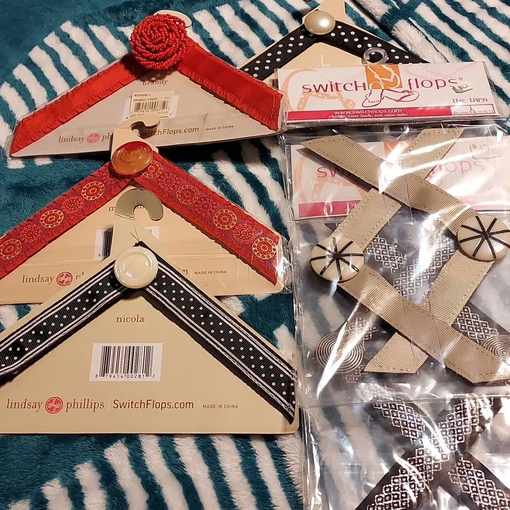 6 -PAIR OF ASSORTED SWITCH FLOPS STRAPS BY LINDSEY PHILIPS INTERCHANGEABLE SIZE LARGE, STILL IN PACKAGING.