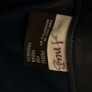 People for Urban Progress Switchman Messenger Bag in Navy Blue. This unique bag is hand-built in Indianapolis using repurposed materials, specifically upcycled Amtrak train seat leather. Featuring an embossed Amtrak logo on the back and a 'PUP' brand patch on the front, it combines industrial history with modern functional design.