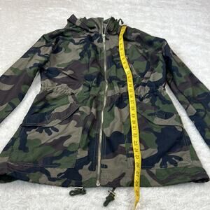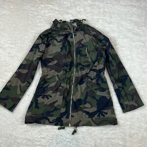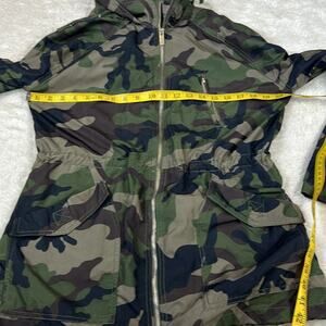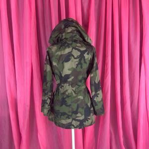 Lightweight hooded military army jacket in camo. Waist and hem can be cinched, hood cannot be removed, and the pockets are functional.