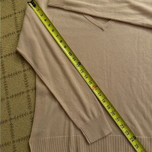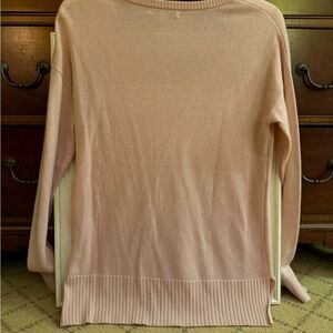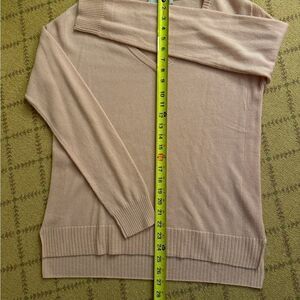 SWTR Pale Pink cashmere blend long sleeved pullover V Neck sweater with ribbed cuffs and hem. Boxy fit. Ribbed detail around the V neck. Side slits on both sides, and slight high low hem. Extra yarn packet still attached. NWOT L