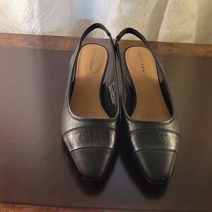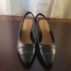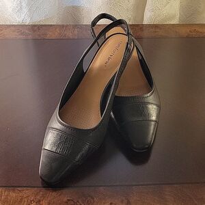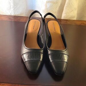 SYBILL SLINGBACK POINTED TOE WOMEN"S SHOE SIZE 7M COLOR BLACK VERY LOW HEEL ALL MANMADE MATERIALS THIS ITEMS IS PRE-OWNED EXCELLENT CONDITION YOU MIGHT MISTAKE FOR NEW CHECK THE PICTURES