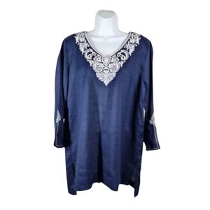 This stylish navy blue blouse features elegant white embroidery, perfect for elevating your wardrobe. Ideal for any occasion.