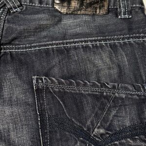 SYN Jeans blue, vintage 80’s distressed jeans with fray on the bottom of the pants. Button fly, 5 pockets, logo on the back, Size 32/32 (I measured to make sure) hundred percent cotton, RN111394