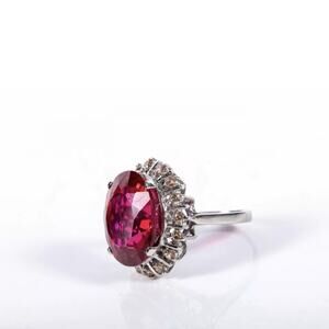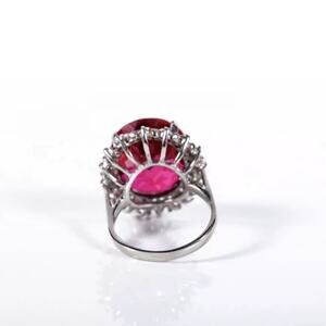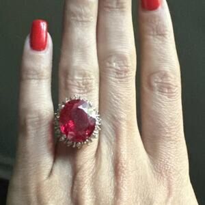 This is a beautiful sterling silver ring featuring a synthetic ruby and cubic zirconia stones. The ring is size 6 1/2. The ring is in excellent condition and would make a great addition to any jewelry collection. It's perfect for dressing up a casual outfit or adding a touch of glamour to a formal look. This ring is sure to turn heads and spark conversations. Don't miss out on the opportunity to own this stunning piece of jewelry. Grab it now!