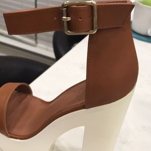 SZ 6 HEELS strap around ankle.WHITE SOLES Color is “luggage tan”. In unused con.