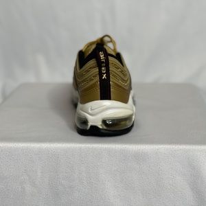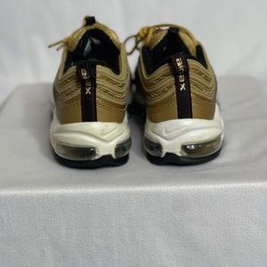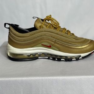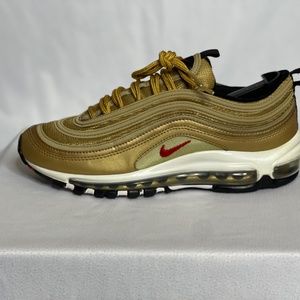DON'T MISS OUT ON A GREAT BUY FOR THE COLLECTION!! AUTHENTIC PRE OWNED!!! SIZE 7 NIKE AIRMAX 97 OG QUICK STRIKE "METALLIC GOLD" (GS) RETRO RELEASE!!!!!! NEVER FAKE!! PERFECT BUY FOR ROTATION. WHAT YOU SEE IS WHAT WILL ARRIVE!!!! **SHOES COME WITHOUT ORIGINAL BOX** **SHOES COME WITHOUT IN-SOLES"