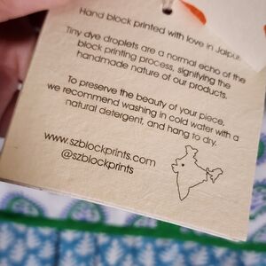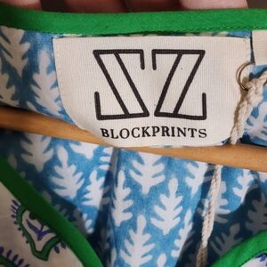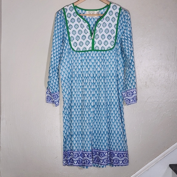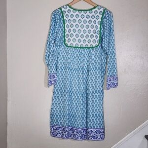 Stylish blue and white dress with green accents. Features intricate patterns and a comfortable fit.