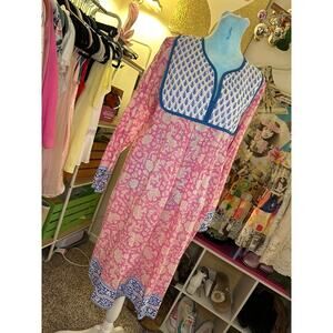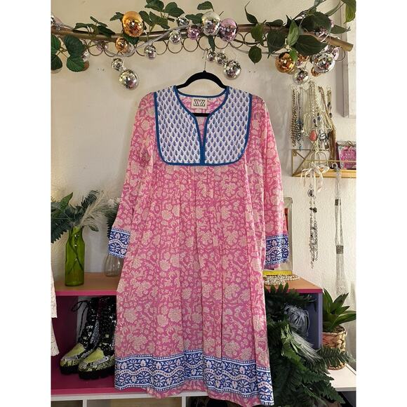 Add a pop of color to your wardrobe with this charming dress, featuring a playful floral pattern on a lovely pink base. The knee-length, long-sleeved design offers a perfect blend of elegance and comfort. With contrasting blue and white patterns adorned with small leaf motifs on the neckline, cuffs, and hem, this dress brings a delightful touch of whimsy to any occasion. Displayed beautifully in a boutique-like setting, this dress is a wonderful choice for those who love to stand out in style.