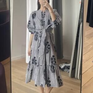 Easy dressing this comfy cottagecore midi dress out of cool 100% cotton, in a breezy striped and velvet flocked floral print, belted waist, plus side pockets, ruffle hem with puff 3/4 sleeves Great beach, resort wear, warm weather find.