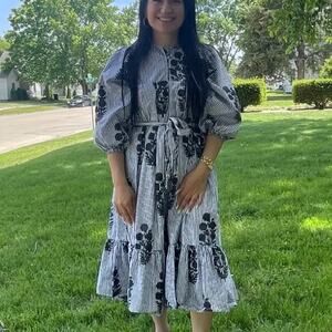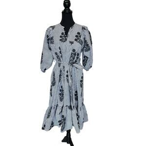 SZ Blockprints Navy Blue Midi Dress MEDIUM Cotton Cottage Strip Puff Sleeve $358
